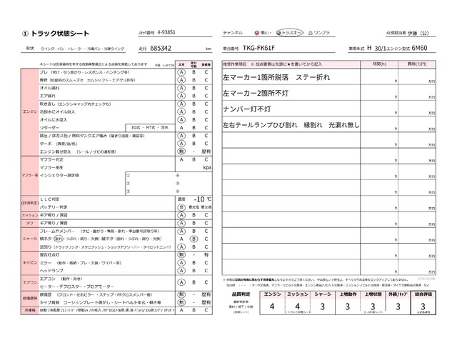 | キャビン | 小傷程度 | きれいな状態 | 多少の傷・凹み | 機能上問題なし | 一定の修理推奨 | 検査基準に該当しない |