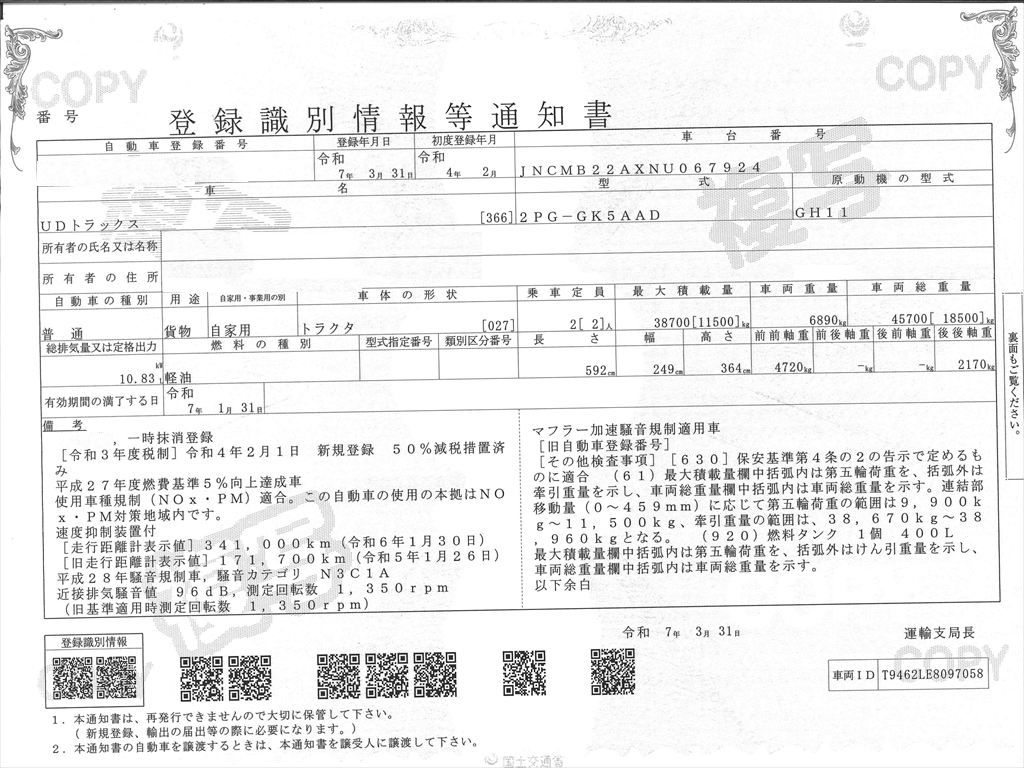 第五輪荷重11,500㎏取れていますので3軸も牽引できるなど、汎用性に優れた1台です。