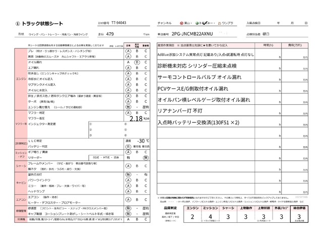 | キャビン | 小傷程度 | きれいな状態 | 多少の傷・凹み | 機能上問題なし | 一定の修理推奨 | 検査基準に該当しない |