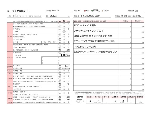 | キャビン | 小傷程度 | きれいな状態 | 多少の傷・凹み | 機能上問題なし | 一定の修理推奨 | 検査基準に該当しない |