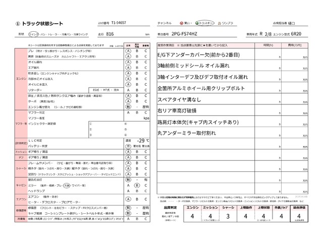 | キャビン | 小傷程度 | きれいな状態 | 多少の傷・凹み | 機能上問題なし | 一定の修理推奨 | 検査基準に該当しない |
