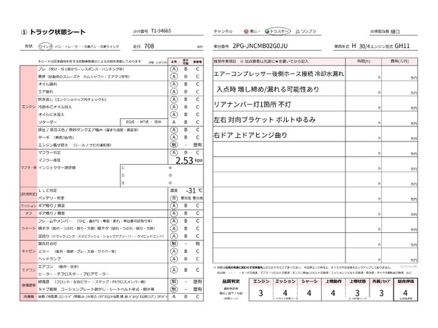 | キャビン | 小傷程度 | きれいな状態 | 多少の傷・凹み | 機能上問題なし | 一定の修理推奨 | 検査基準に該当しない |