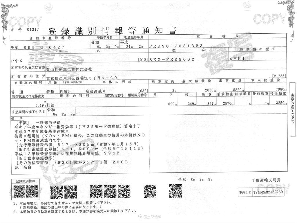 荷台長607㎝幅235㎝高さ214㎝