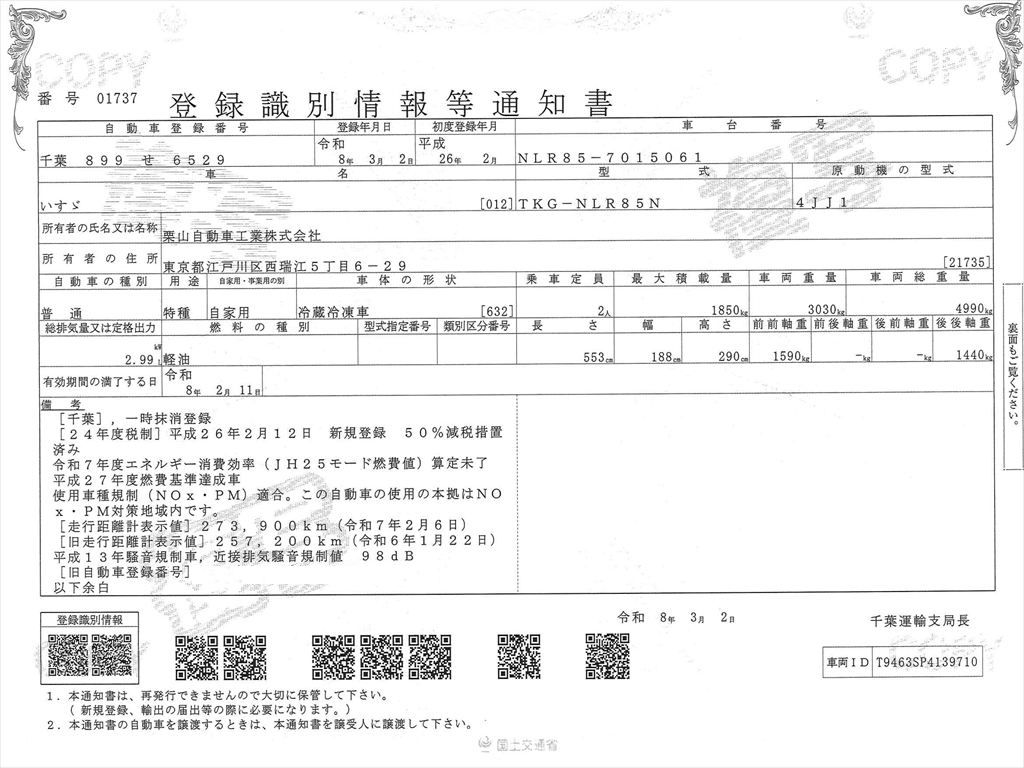★最大積載量:1850㎏ 車輌総重量:4990㎏