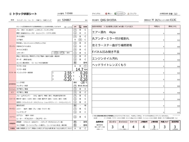 | キャビン | 小傷程度 | きれいな状態 | 多少の傷・凹み | 機能上問題なし | 一定の修理推奨 | 検査基準に該当しない |