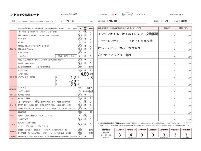 | キャビン | 小傷程度 | きれいな状態 | 多少の傷・凹み | 機能上問題なし | 一定の修理推奨 | 検査基準に該当しない |