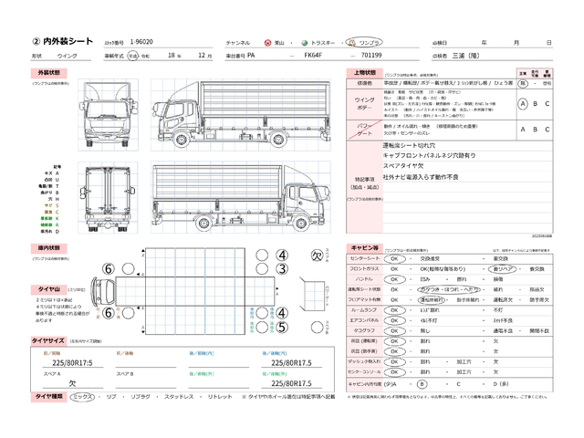 | キャビン | 小傷程度 | きれいな状態 | 多少の傷・凹み | 機能上問題なし | 一定の修理推奨 | 検査基準に該当しない |