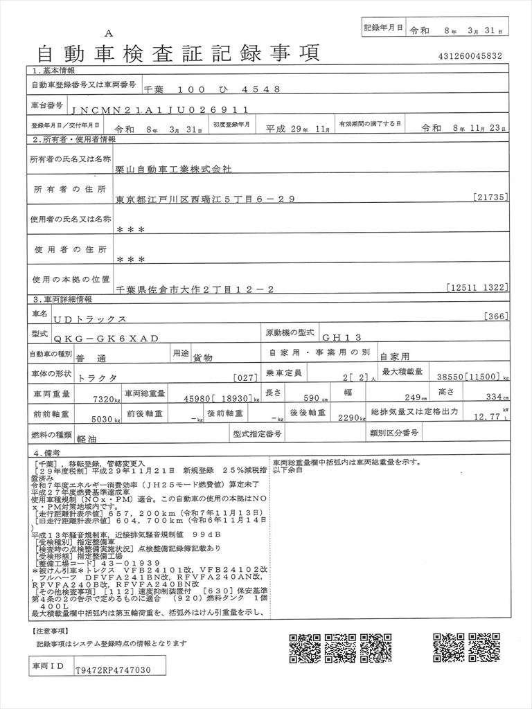 車検付き 450馬力 第五輪11.5トン UDクオン