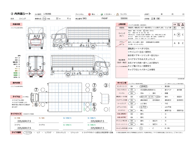 | キャビン | 小傷程度 | きれいな状態 | 多少の傷・凹み | 機能上問題なし | 一定の修理推奨 | 検査基準に該当しない |