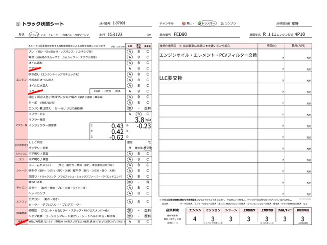 | キャビン | 小傷程度 | きれいな状態 | 多少の傷・凹み | 機能上問題なし | 一定の修理推奨 | 検査基準に該当しない |